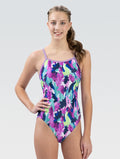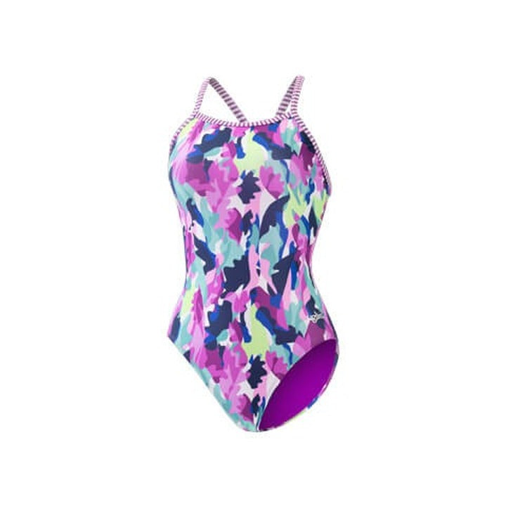 Dive into style with the Dolfin Women's Uglies Hideout V-Back One Piece Swimsuit! This eye-catching suit features a vibrant vertical camo print in purples, blues, mint, white, and lime, making it a standout choice for your swim sessions. The signature Uglies candy stripe binding on the straps and fully lined violet interior add a playful touch. Designed with both comfort and fit in mind, this swimsuit is chlorine-resistant, ensures excellent shape and color retention, and provides UPF 50+ protection. The V-back design with an open keyhole back detail and performance leg cut offers a secure and streamlined fit, perfect for long hours in the water. As a training suit, it's engineered to fit snugly without bra construction or cups, allowing you to move freely and confidently during your swim.