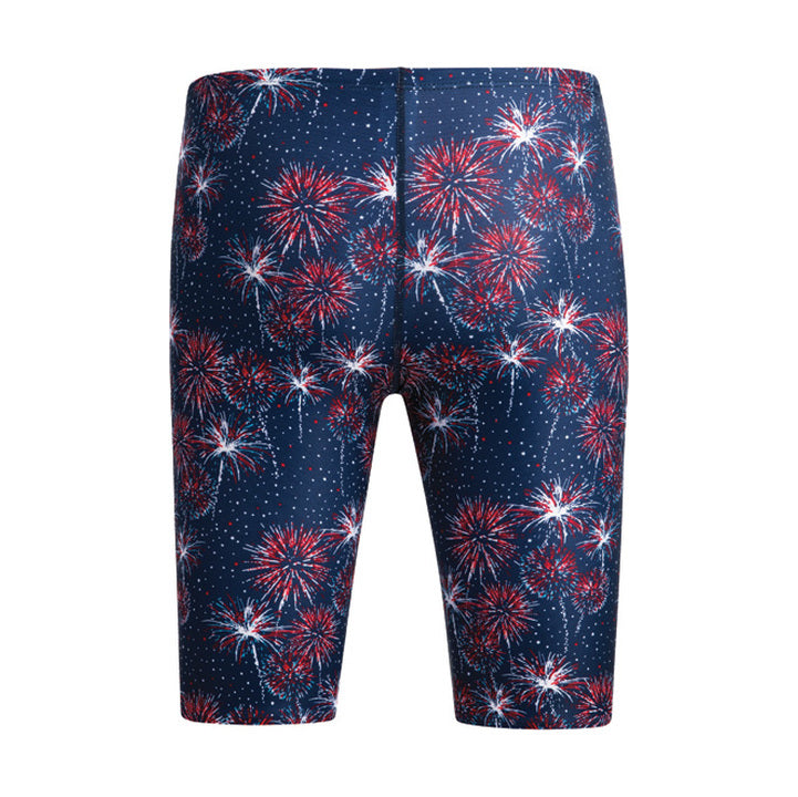Blast off in the new Dolfin Uglies Fireworks Jammer! Perfect for the upcoming Olympic season, this suit features a vibrant red and white fireworks on a blue background. The polyester fabric construction ensures long-lasting durability and chlorine resistance. Front drawcord with Uglies Candy Striping for added security.