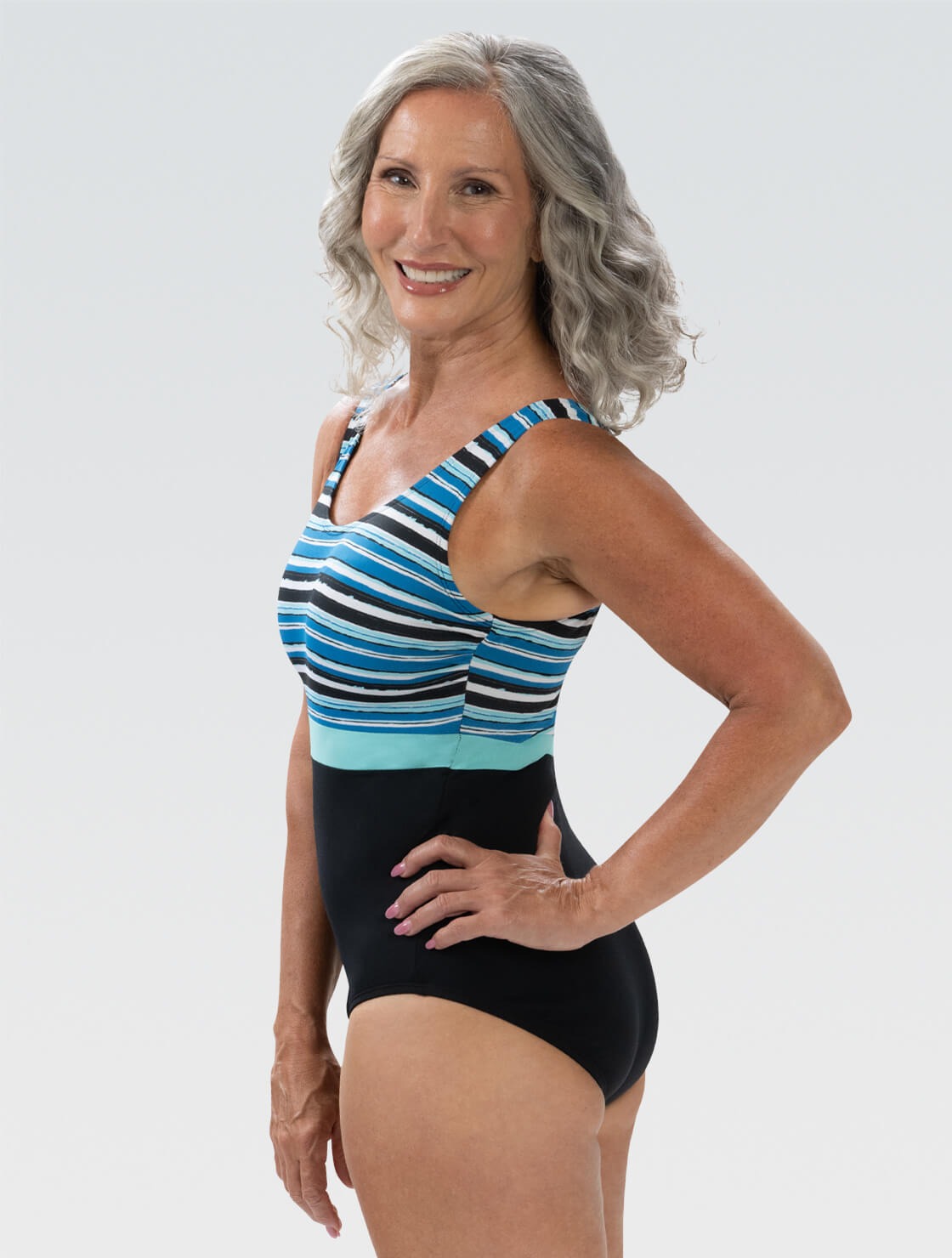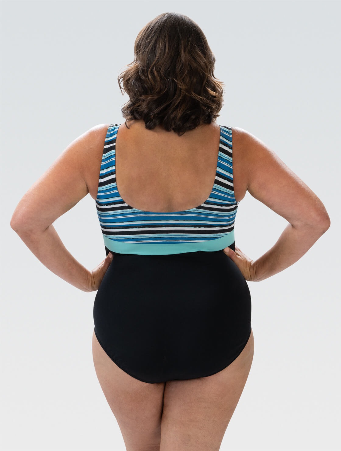 Stay stylish and sun protected with Aquashape Women\'s Wanderlust Color Block Moderate Scoop Back One Piece Swimsuit in Santorini print. Designed by women for women with Chlorine and pilling resistant. A must-have on your next swim trip!