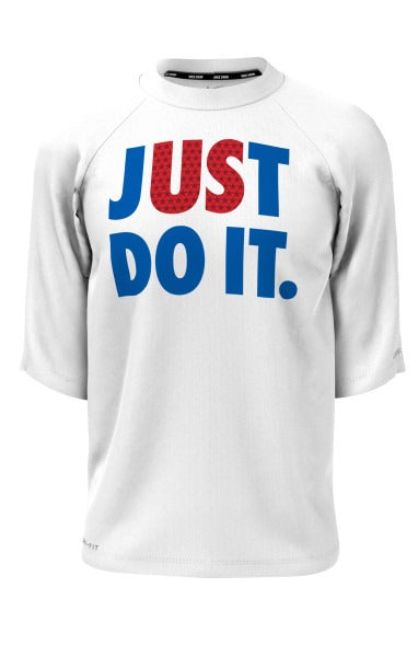 Stay dry and warm after practice with the Nike JDI Americana Short Sleeve Hydroguard. The UV protection helps protect you from the harmful rays of the sun. Designed with an internal neck tape that offers added comfort against your skin.