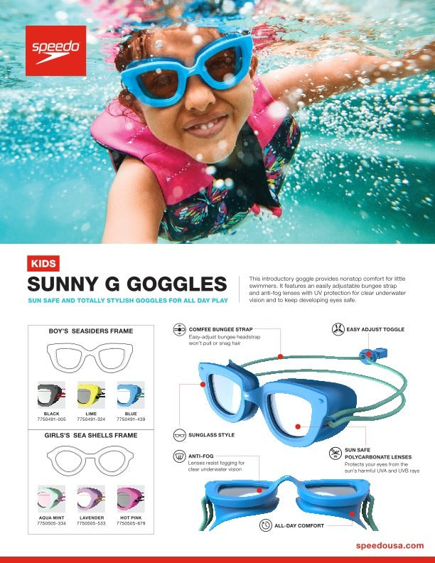 The Speedo SUNNY G Seaside Kids’ Goggles are designed for young swimmers learning to love the water. Comfortable, easy-to-adjust, and protective.